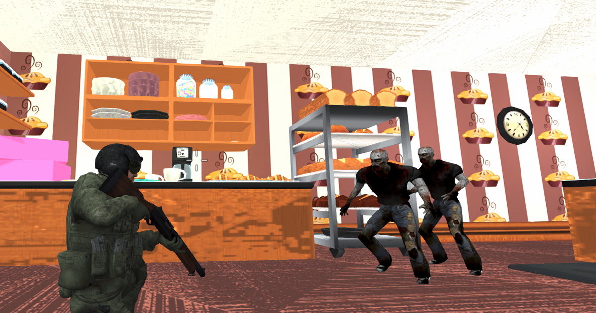 “Bakery Protection” is an exciting online video game that pits players against hordes of hungry, flesh-eating zombies who are intent on devouring everything in sight, including the delicious treats in your bakery! As the player, you are tasked with defending your bakery from these undead attackers, using an array of weapons and defenses to keep them at bay. The game is set in a post-apocalyptic world where a virus has turned most of the population into zombies. As the last surviving baker in the city, it’s up to you to protect your bakery at all costs. With each wave of zombies that comes your way, you must use your skills and strategic thinking to build and upgrade your defenses, set traps, and unleash powerful attacks to keep the zombies at bay. The game features a variety of different levels, each with its own unique challenges and zombie types. As you progress through the levels, you will encounter tougher and more dangerous zombies, including giant bosses that will require all your skills to defeat. With its addictive gameplay, fast-paced action, and satisfying zombie-smashing mechanics, “Protect the Bakery from Zombies” is a game that will keep you coming back for more. So grab your weapons, stock up on supplies, and get ready to defend your bakery from the zombie apocalypse! WASD – Move. LMB – Shoot. RMB – Aim. Mouse Wheel – Change weapon. R – Reload. Space – Jump. TAB – Pause.