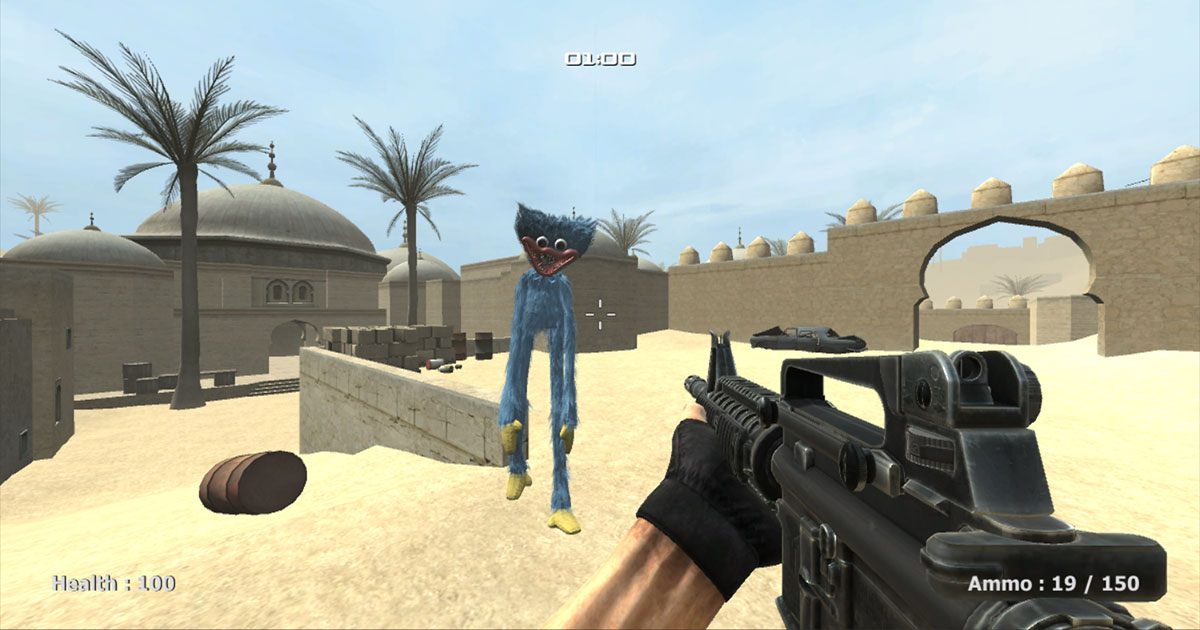 Poppy Strike is a 3D shooting game which features gun game mode with big arsenal of weapons and famous dust 2 map crowded with huggy wuggy, your mission is to shoot all incoming huggy wuggy and try to survive by the end of each round in order to get new weapons. *WASD* = move*mouse* = shoot*space* = jump*r* = reload*p* = pause*1234* = select weapon