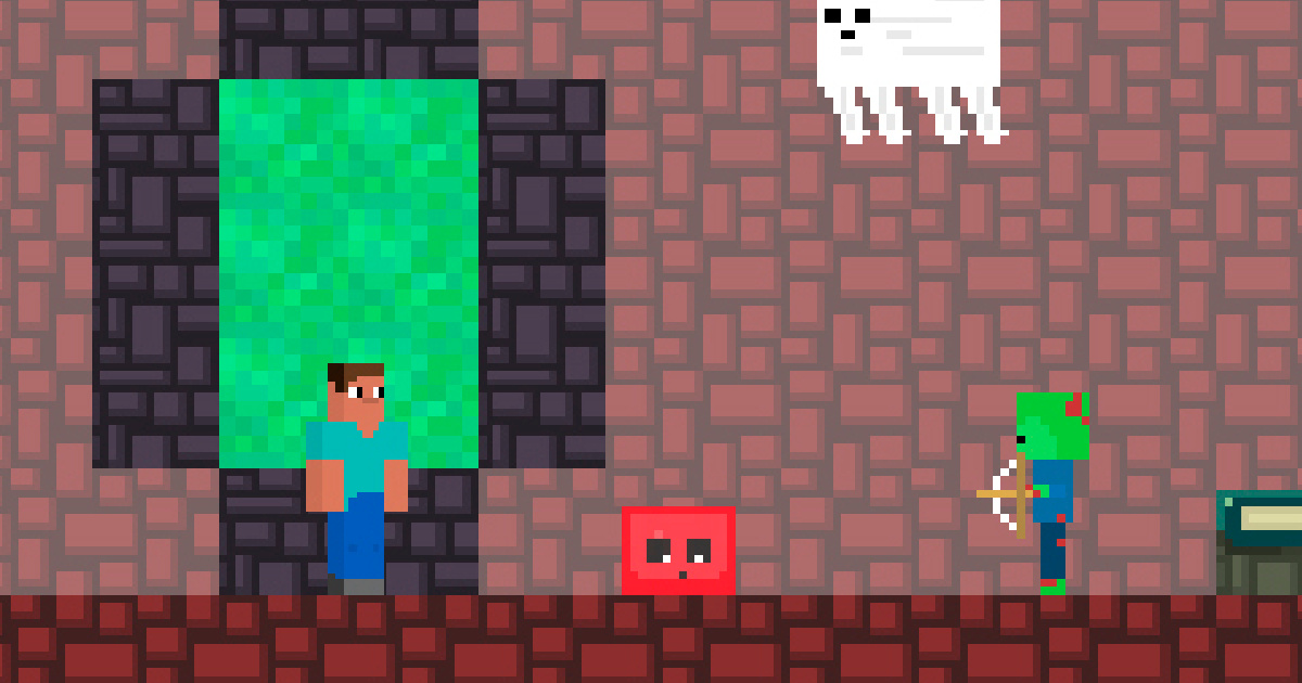 You have to help the cute steven go through the portal and reach the green chest in the red dark. come on what are you waiting for help and make steve reach the ballot box. Be careful now, more dangerous flying monsters, slime walking on the ground and zombies shooting arrows are waiting for you. PRESS “a” KEY to stop. press the “w” key to jump. You can jump twice.(double jump) mobile touch control