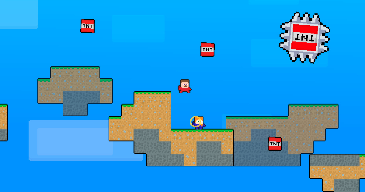 There are 2 astronauts who need to survive in the world of skyblock, one of them is steve and alex. Help two fellow astronauts and make them reach the portal or they may lose. There are dangerous tnt rocks and rotating sharp tnts everywhere in the world of skyblock, they can kill you if you leave the safe zone, you will die, be very careful. Collect 3 gold bars with your friend and one of you will reach the portal. *Press any key or touch the screen to start the game. *Use mobile controls to fly on mobile hold them. *Hold down W or Up Arrow to fly on PC. *Collect 3 gold coins to reach the flag.