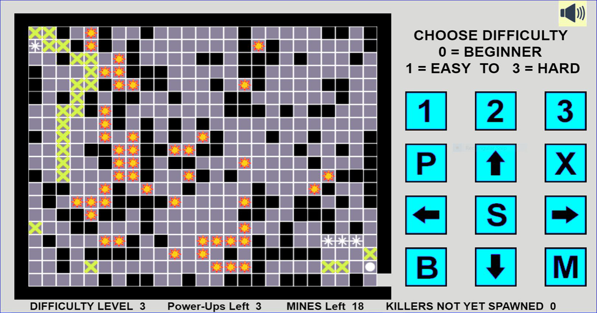 StratEvade 2 (A Sequel to StratEvade — More Features, More Strategy) is a turn-based strategy escape and evasion game. The object of the game is for the PLAYER to move across a large GRID to an EXIT while being pursued by an ever increasing number of spawned KILLERS. The PLAYER may set BARRIERS and MINES to block and destroy the pursuing KILLERS. BLOCKERS are spawned every turn to further impede the PLAYER’s progress. PLAYER may break through a BLOCKER by using a POWER-UP. *arrows**mouse**touch**1..3**b**m**p**s**x*